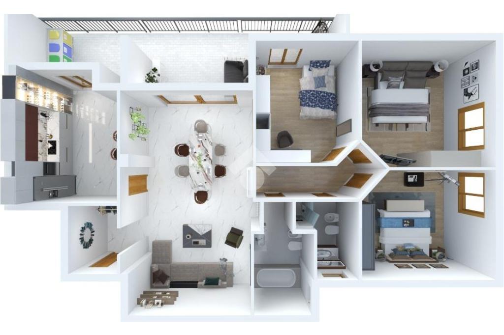 La cucina è abitabile e separata dal soggiorno anch'essa con uscita sul balcone.