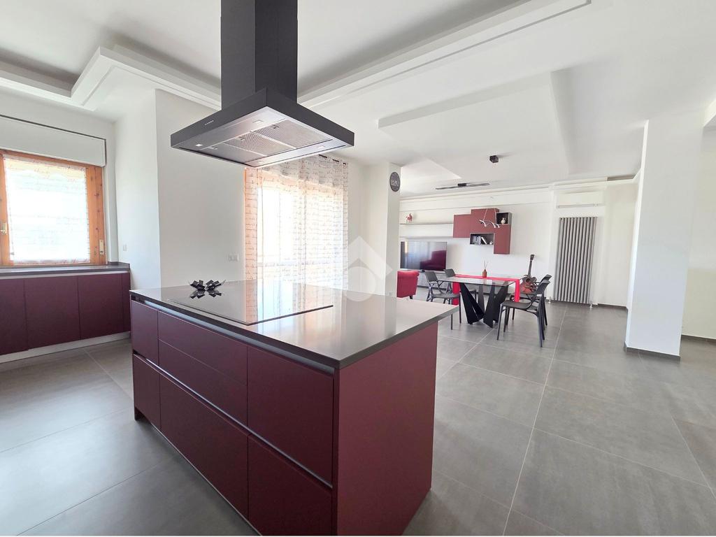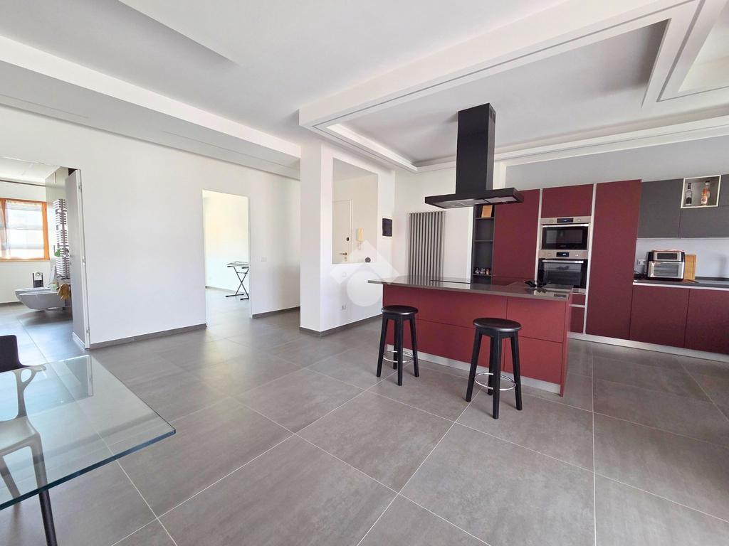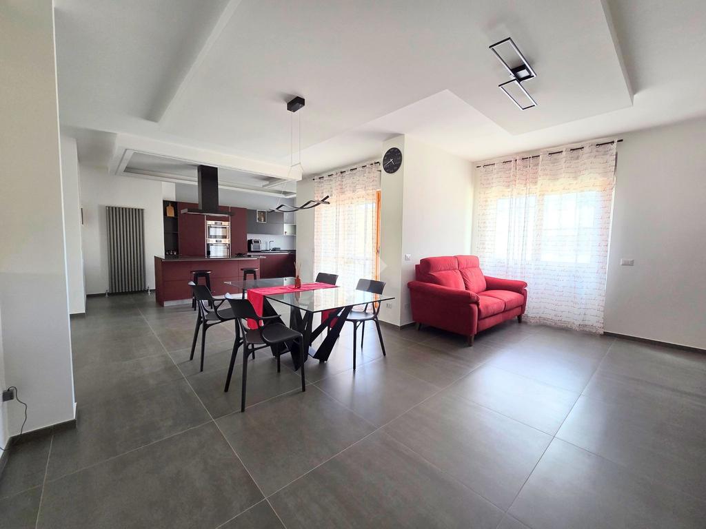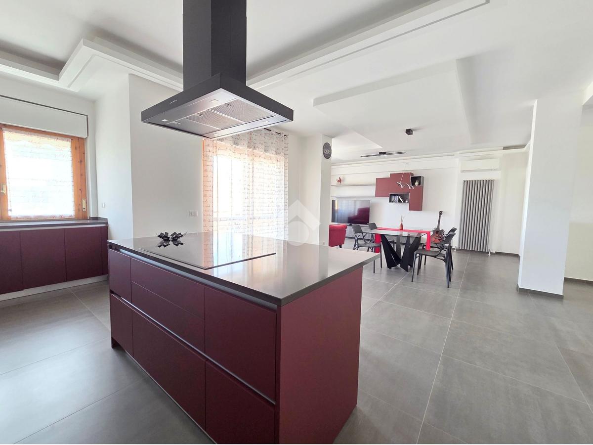 Varcata la porta, troviamo un piccolo ingresso che da' nell'ampio salone dove sulla sinistra trova posto una cucina a vista dotata di finestra e sistemata su due pareti oltre un'isola con piano cottura a induzione e cappa. Gli spazi in questo ambiente sono generosi ed il salone oltre ad avere una uscita sul balcone abitabile ed esposto a ovest, è dotato di un tavolo da pranzo per 6-8 persone. In più abbiamo la zona Tv-relax dove troviamo una parete attrezzata ed un divano con tanto spazio ancora da sfruttare oltre ad un terzo punto luce consistente in un'ampia finestra. L'intero ambiente descritto è di circa 60 mq, molto luminoso e dotato di controsoffitti con illuminazione a led gestita in domotica.