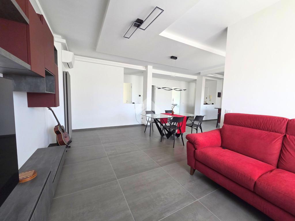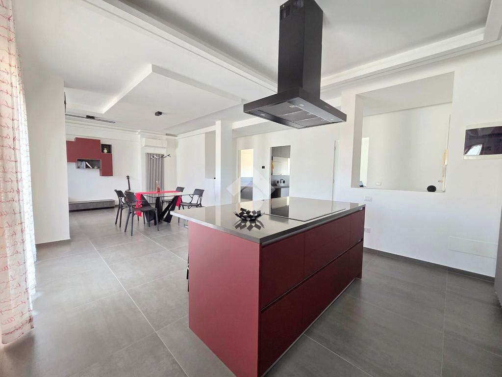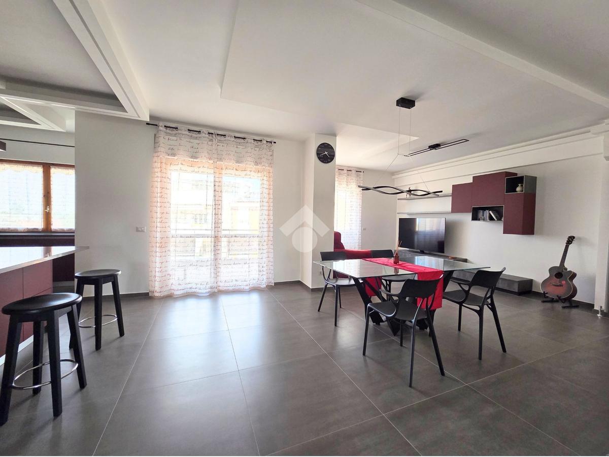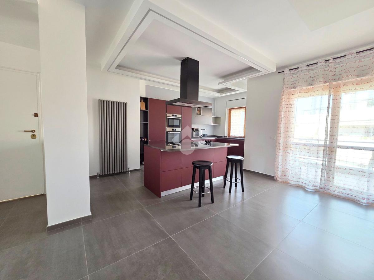 Varcata la porta, troviamo un piccolo ingresso che da' nell'ampio salone dove sulla sinistra trova posto una cucina a vista dotata di finestra e sistemata su due pareti oltre un'isola con piano cottura a induzione e cappa. Gli spazi in questo ambiente sono generosi ed il salone oltre ad avere una uscita sul balcone abitabile ed esposto a ovest, è dotato di un tavolo da pranzo per 6-8 persone. In più abbiamo la zona Tv-relax dove troviamo una parete attrezzata ed un divano con tanto spazio ancora da sfruttare oltre ad un terzo punto luce consistente in un'ampia finestra. L'intero ambiente descritto è di circa 60 mq, molto luminoso e dotato di controsoffitti con illuminazione a led gestita in domotica.