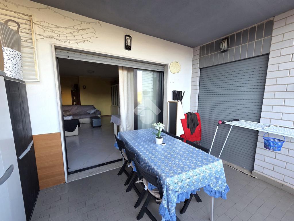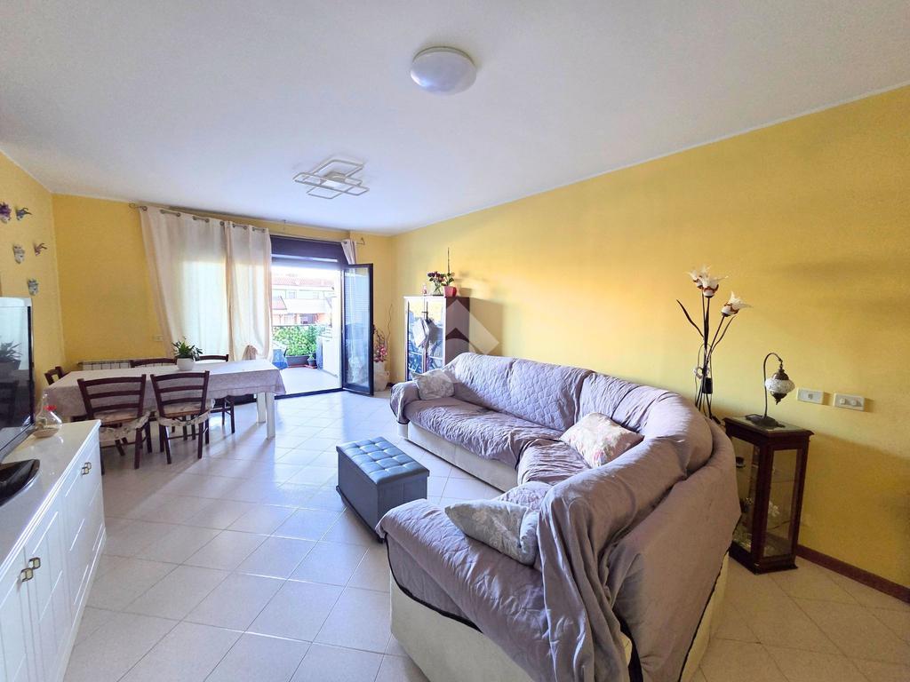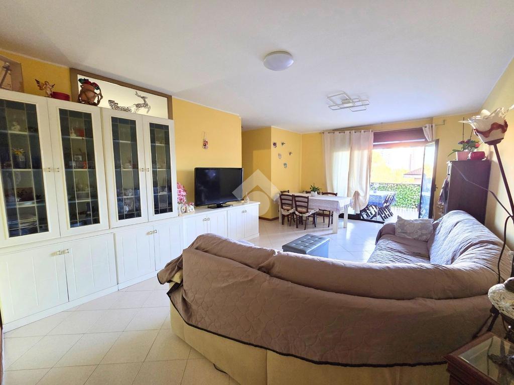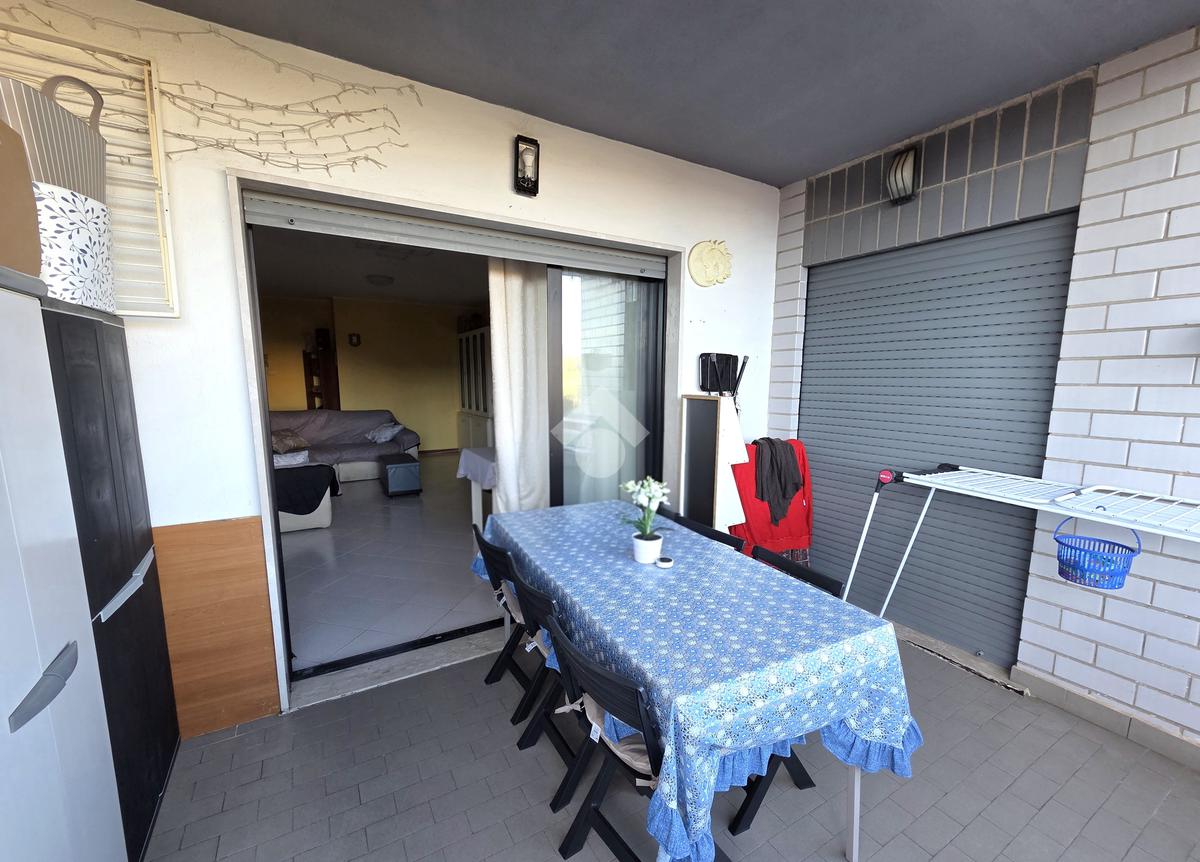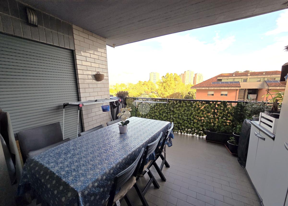 La porta blindata si apre nel luminoso soggiorno che ha uscita sul balcone di 12 mq e gode di un'ottima esposizione.