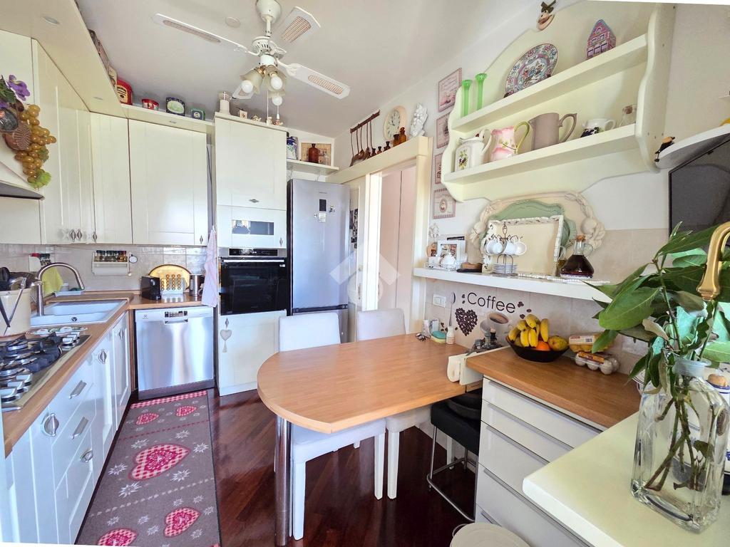 La cucina è abitabile ed al suo interno è posizionata una penisola, da qui è possibile uscire sul balcone dotato di tende da sole con zanzariere e tenda antivento.