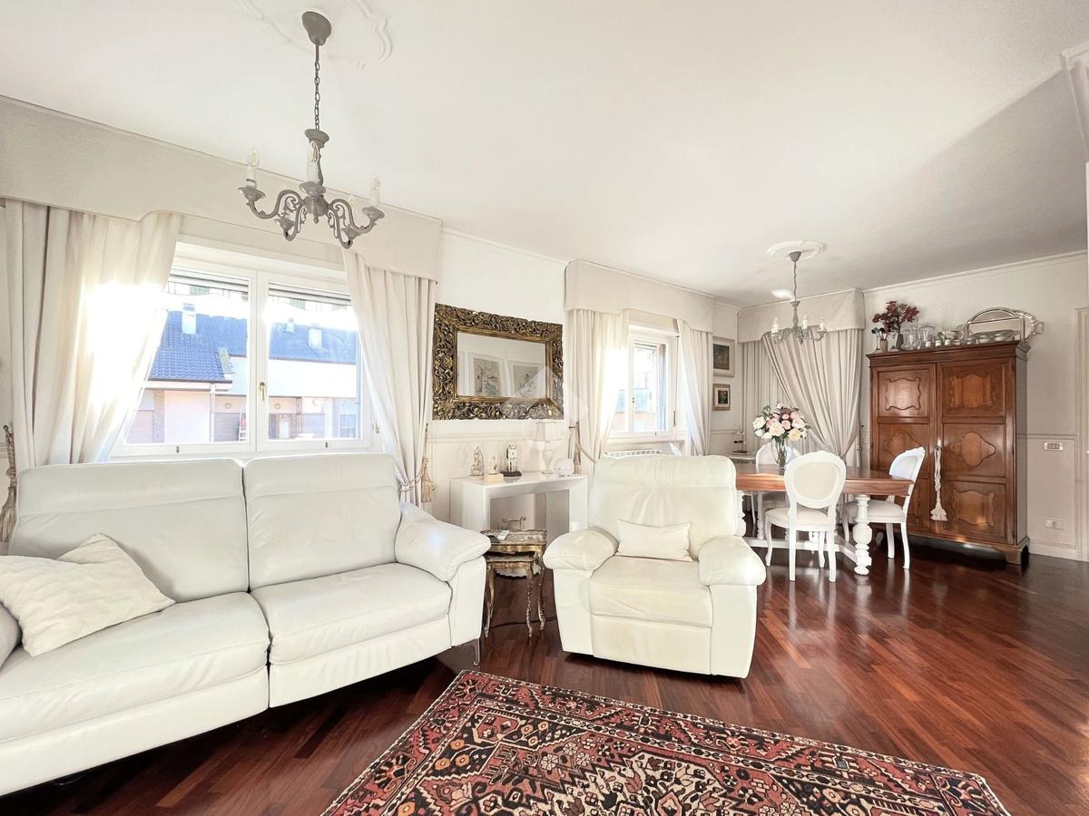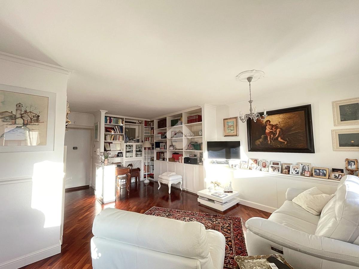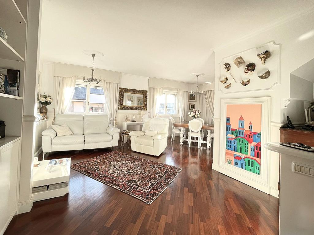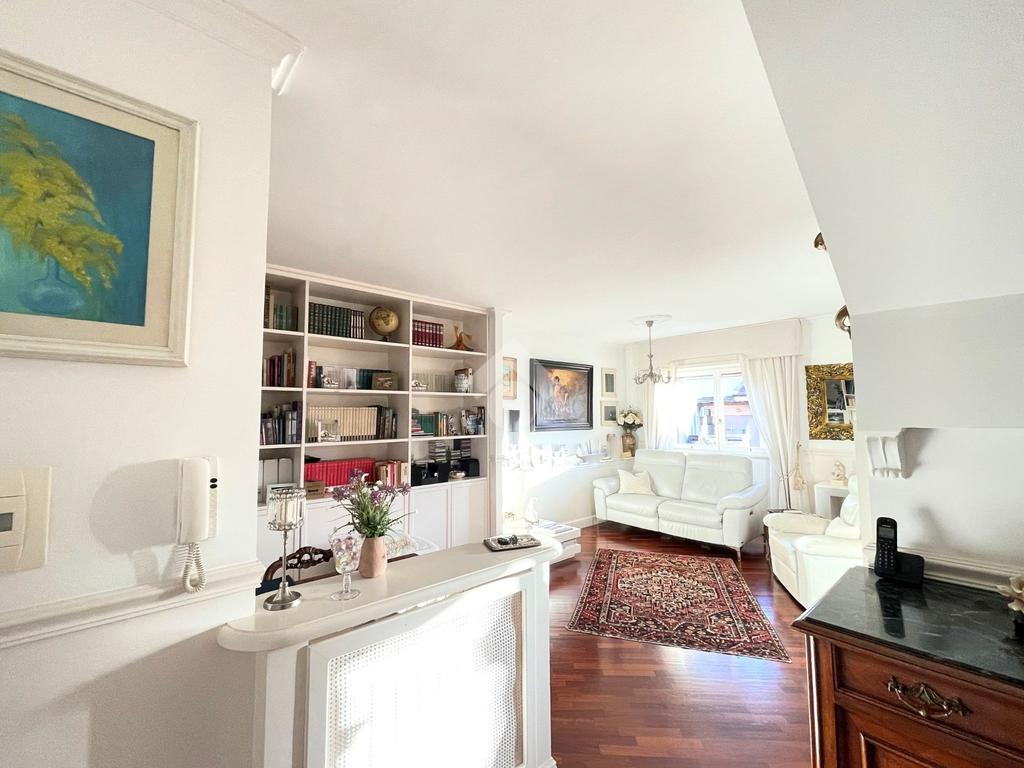 Proseguendo da qui si entra nell'ampio e luminoso soggiorno reso tale dalla presenza di due finestre e di una porta finestra. L'ambiente, per la sua grandezza è strutturato in zona pranzo e zona Tv, ed ospita una libreria in ciliegio realizzata su misura.